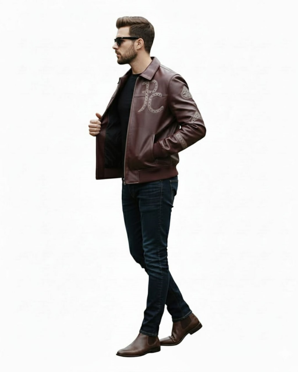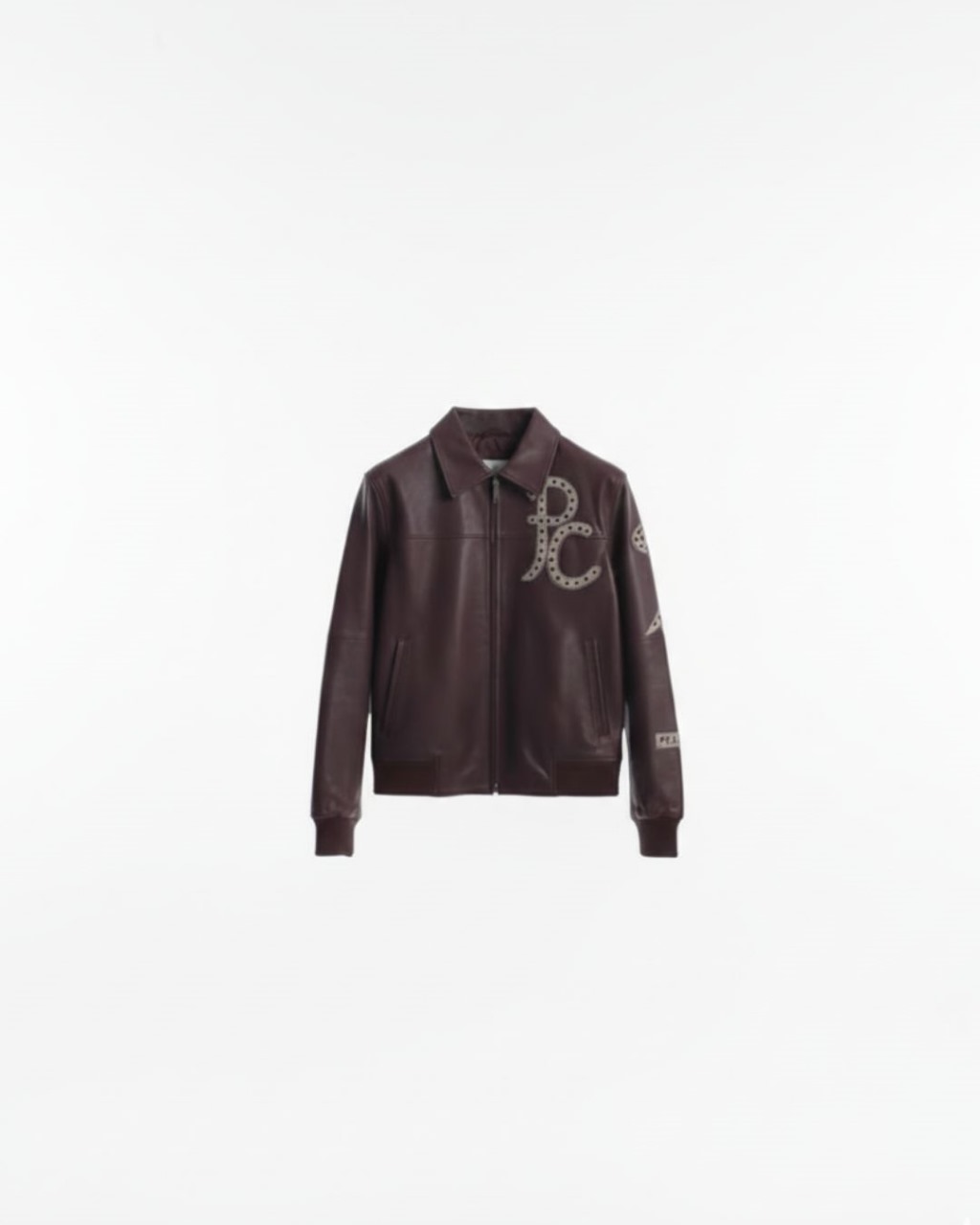Exude effortless sophistication with this deep burgundy leather jacket, a modern take on the classic Harrington silhouette. Crafted from premium, smooth-grain leather, this piece features a rich mahogany hue that pairs perfectly with both casual and formal attire. The left chest is adorned with a large, stylized “PC” monogram, intricately detailed with micro-perforations for a textured, high-end finish. With its clean lines, structured turn-down collar, and tapered ribbed cuffs, this jacket is a versatile staple for the modern gentleman’s wardrobe