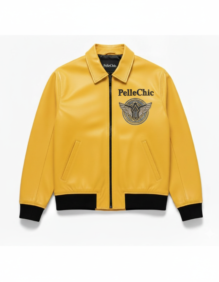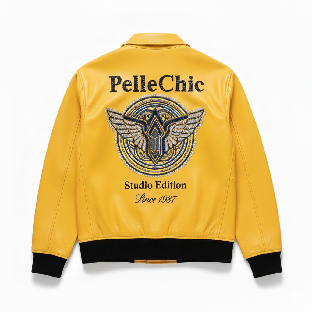 Elevate your streetwear game with the Pelle Chic “Studio Edition”—a pinnacle of luxury and artistic detail. Available in classic Midnight Black and vibrant Canary Yellow, this jacket is designed for those who value heritage and high-shine aesthetics.