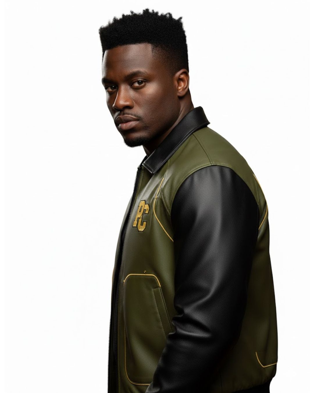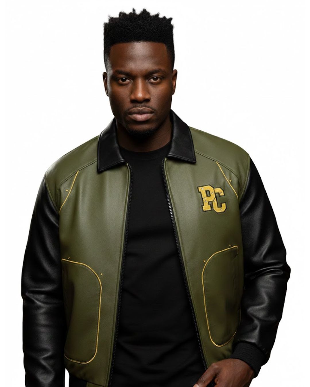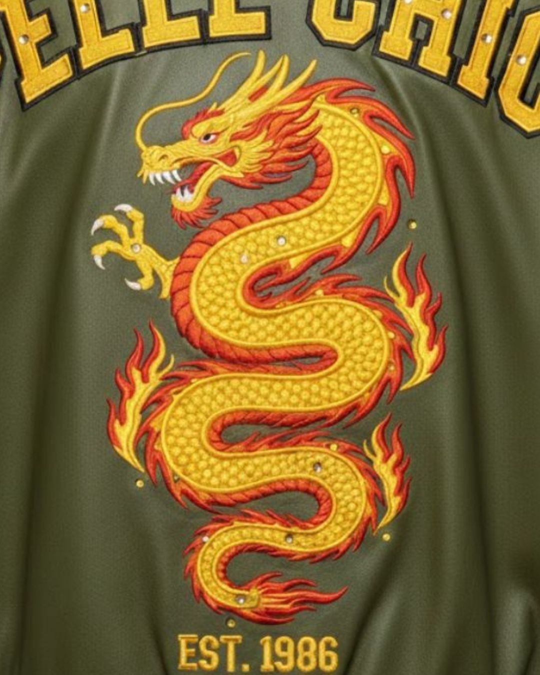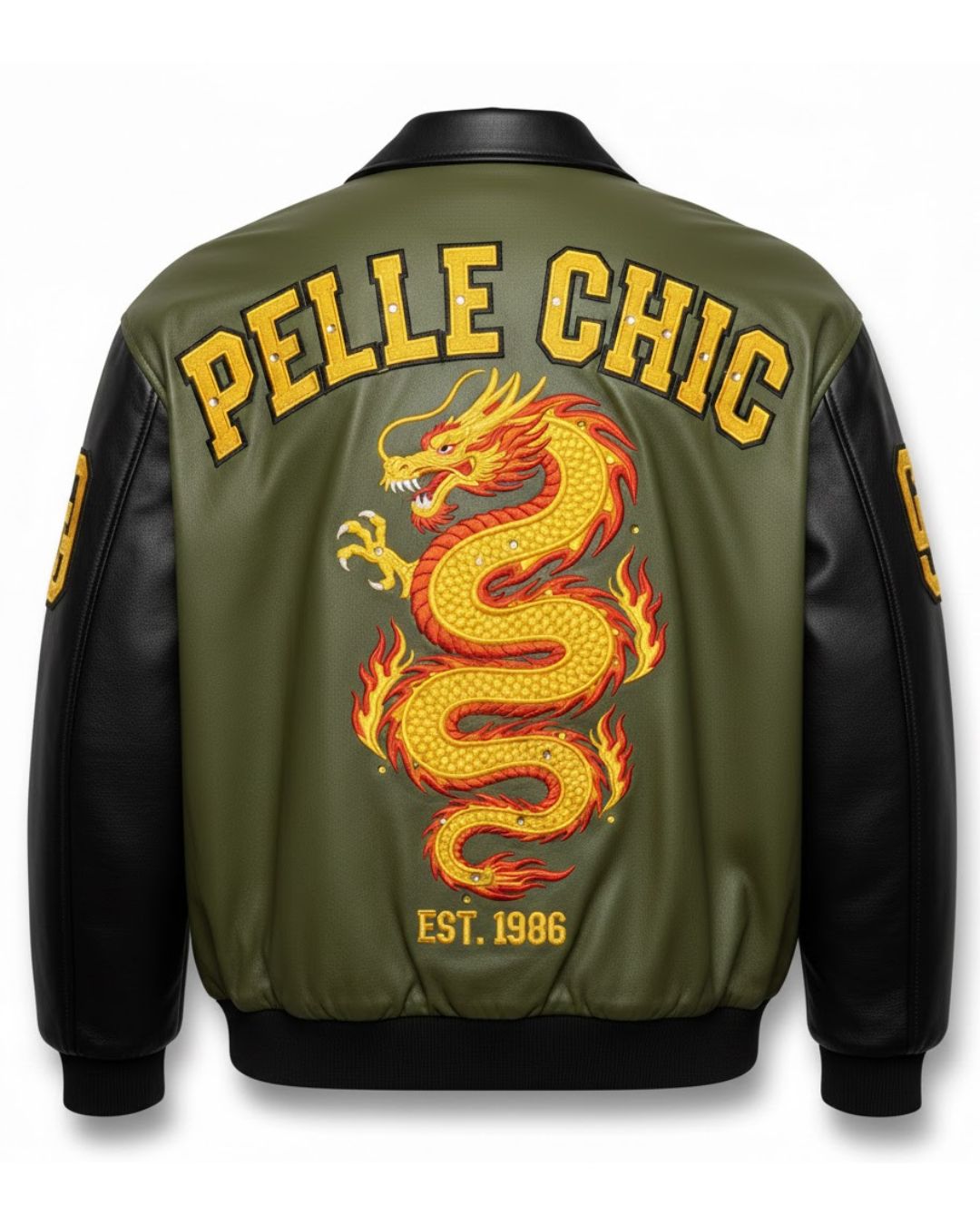 Crafted with high-quality leather and a modern varsity silhouette, the olive green body combined with black sleeves creates a powerful and stylish contrast. The front showcases the classic PC emblem, while the back design highlights a detailed dragon graphic and EST. 1986 heritage mark.