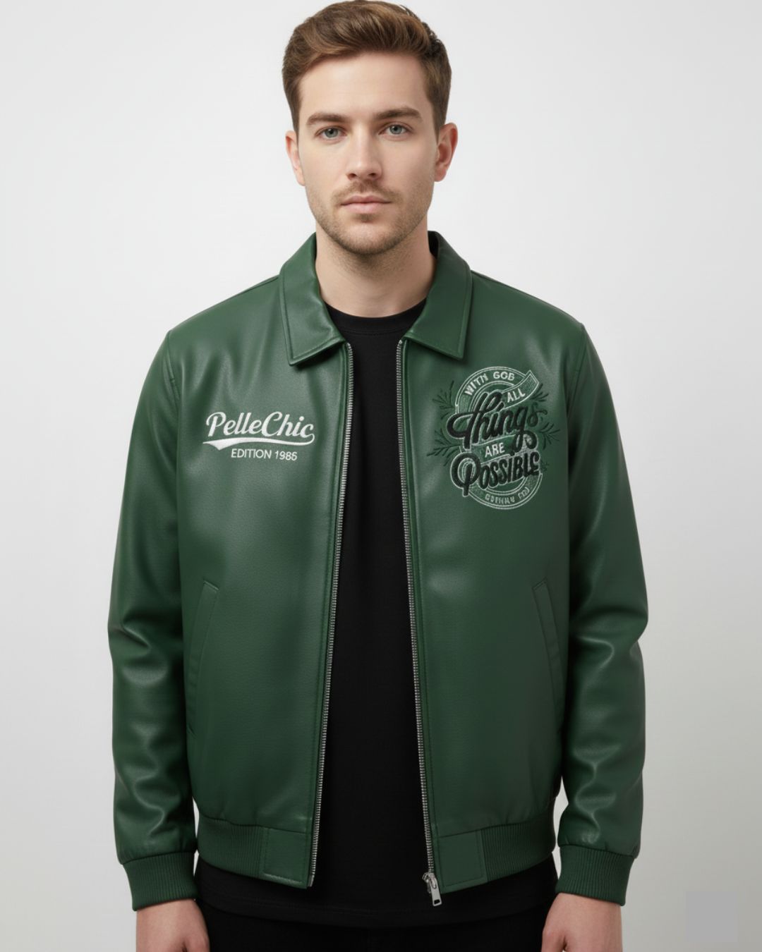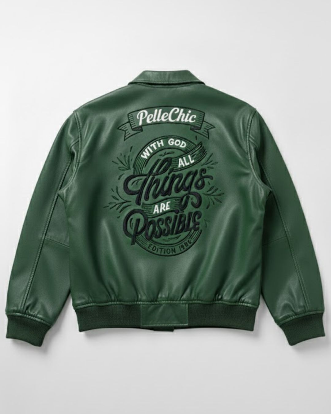 Wear Your Faith, Define Your Style Make a sophisticated statement with the PelleChic “Possible” Edition Bomber. Drenched in a rich Forest Green hue, this jacket combines a powerful motivational message with the timeless elegance of premium leather craftsmanship.