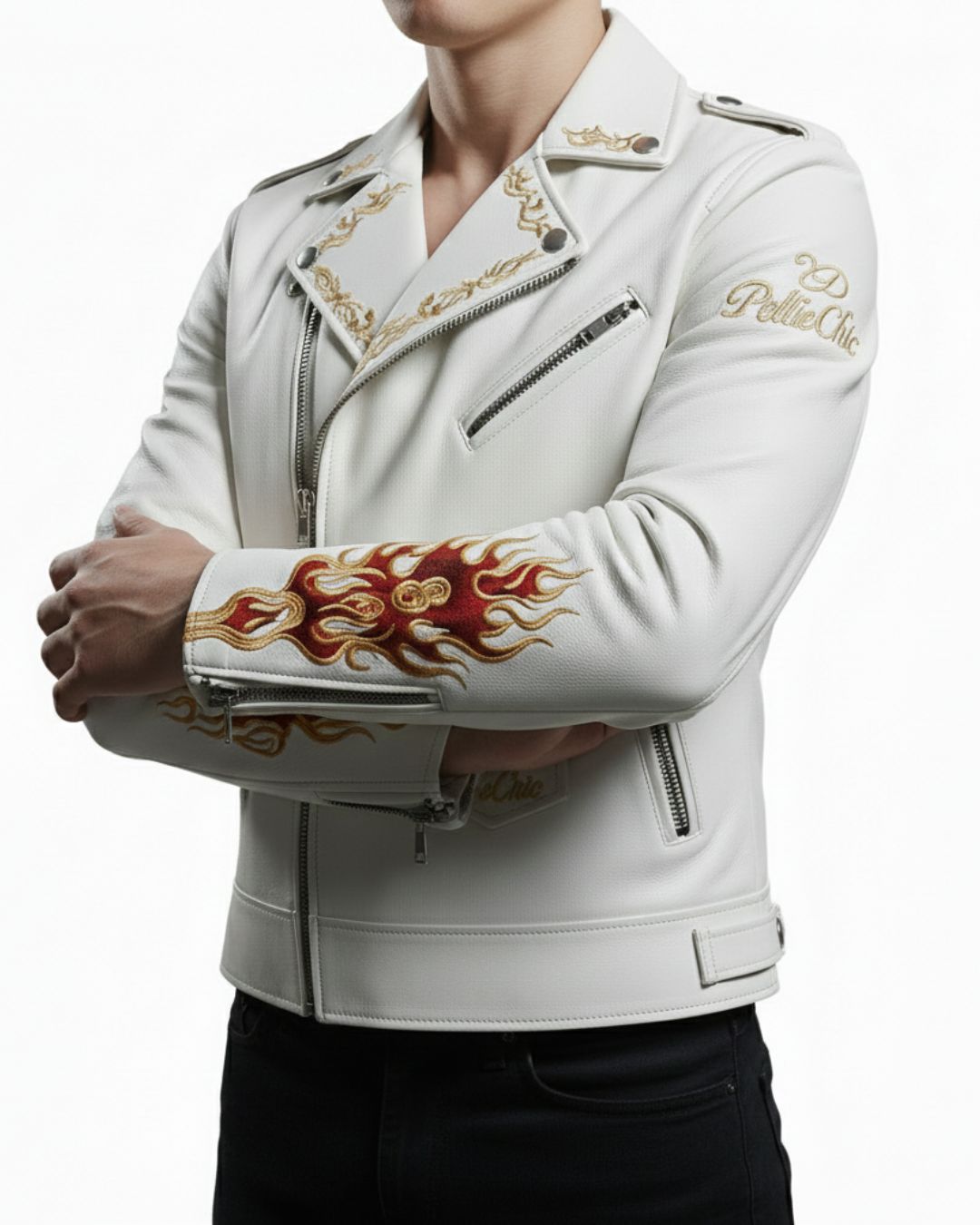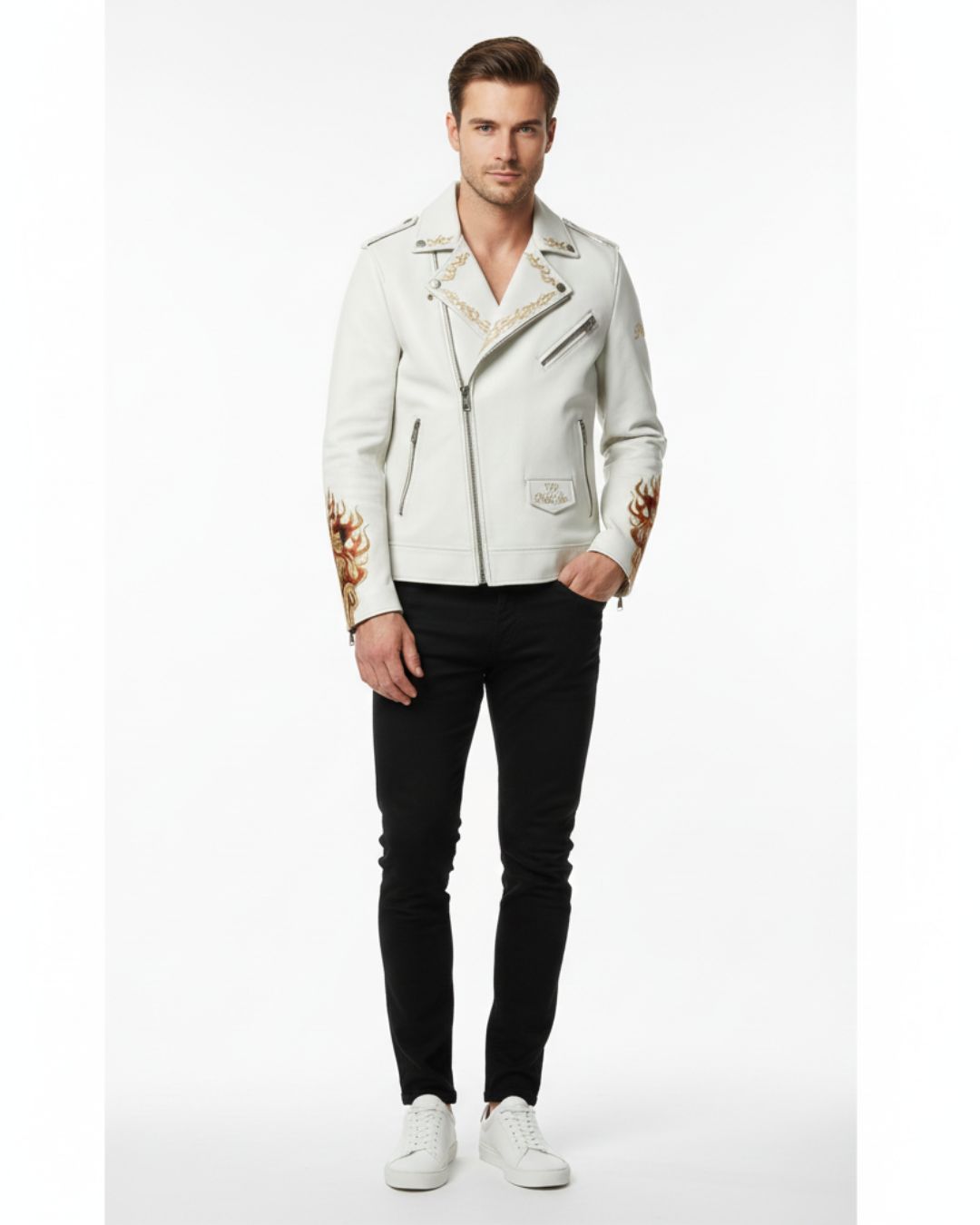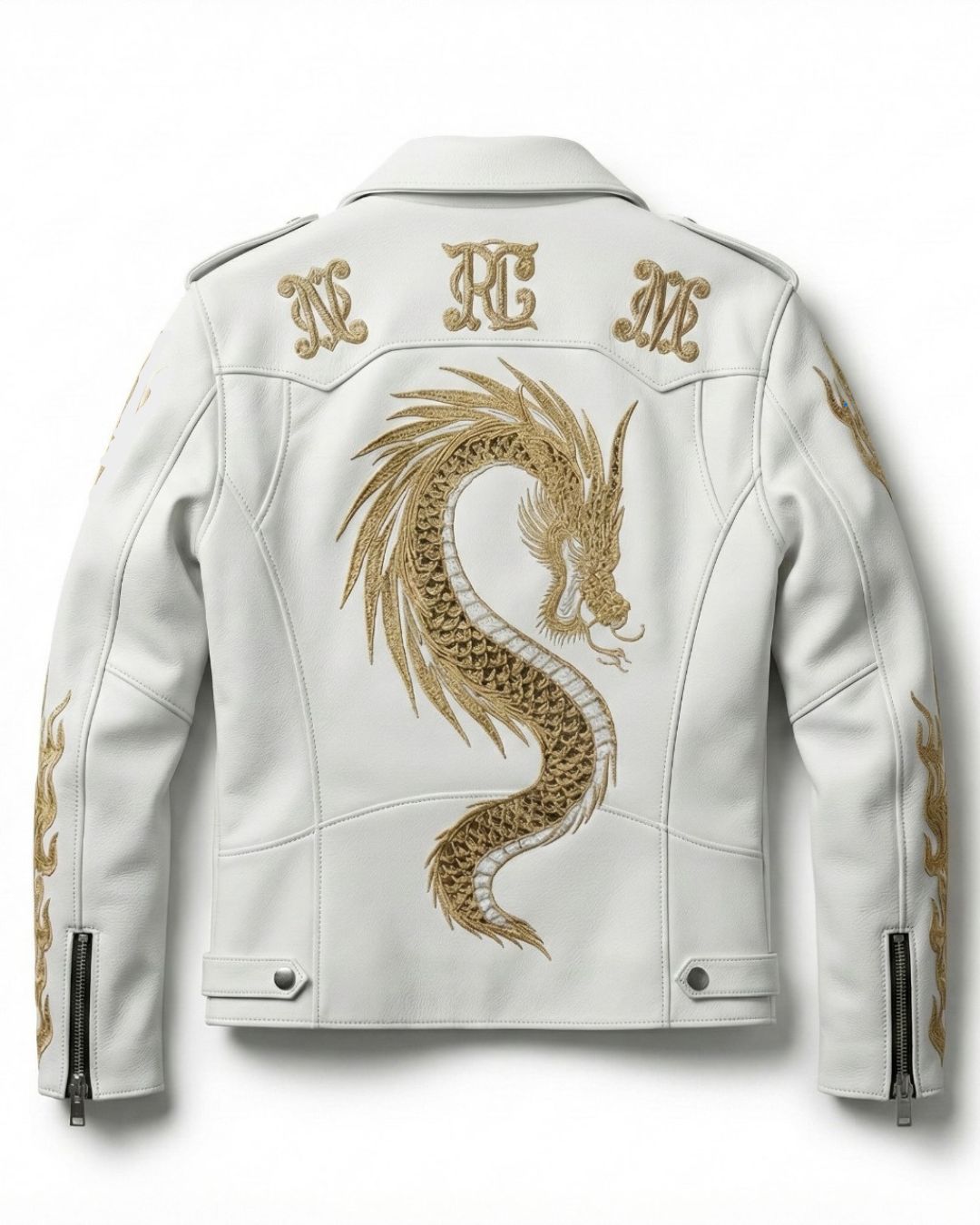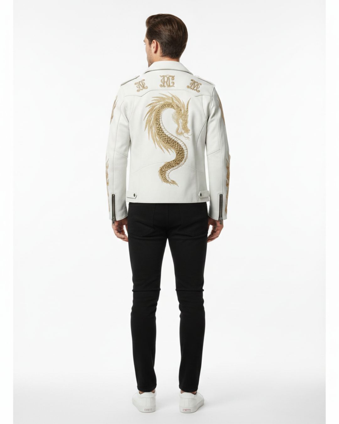 The PelleChic Golden Dragon Embroidered Leather Jacket is a symbol of power, elegance, and timeless luxury. Crafted from premium white leather, this jacket features an exquisite gold embroidery of a majestic dragon on the back — representing strength, prosperity, and fearless style.