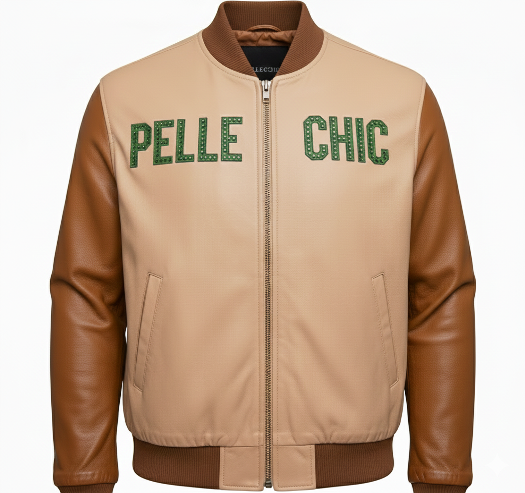 The detailed green and brown embroidery stands out beautifully against the soft neutral leather base, while stud embellishments add depth and a premium finish. The bold PELLECHIC branding and LIMITED EDITION embroidery enhance the exclusivity of this statement piece.