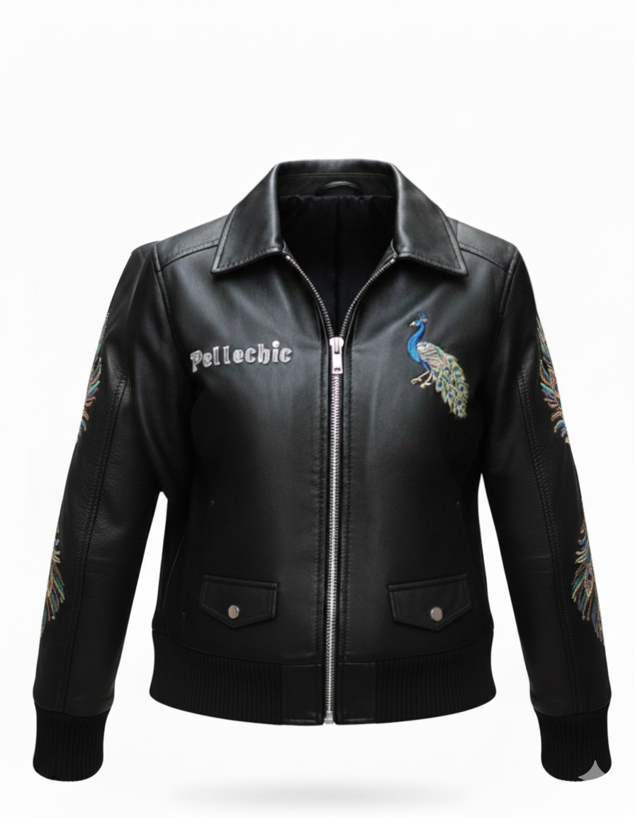 A Symphony of Color and Craftsmanship Step into the world of elite fashion with the PelleChic Majestic Peacock Bomber. This jacket is a breathtaking tribute to nature’s most beautiful bird, featuring an explosion of colors and high-end embroidery that redefines luxury streetwear.