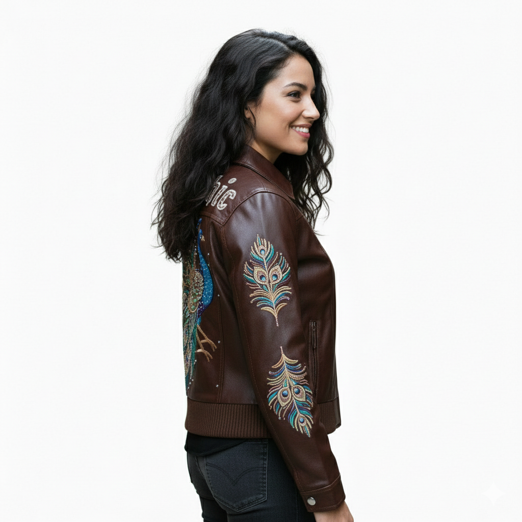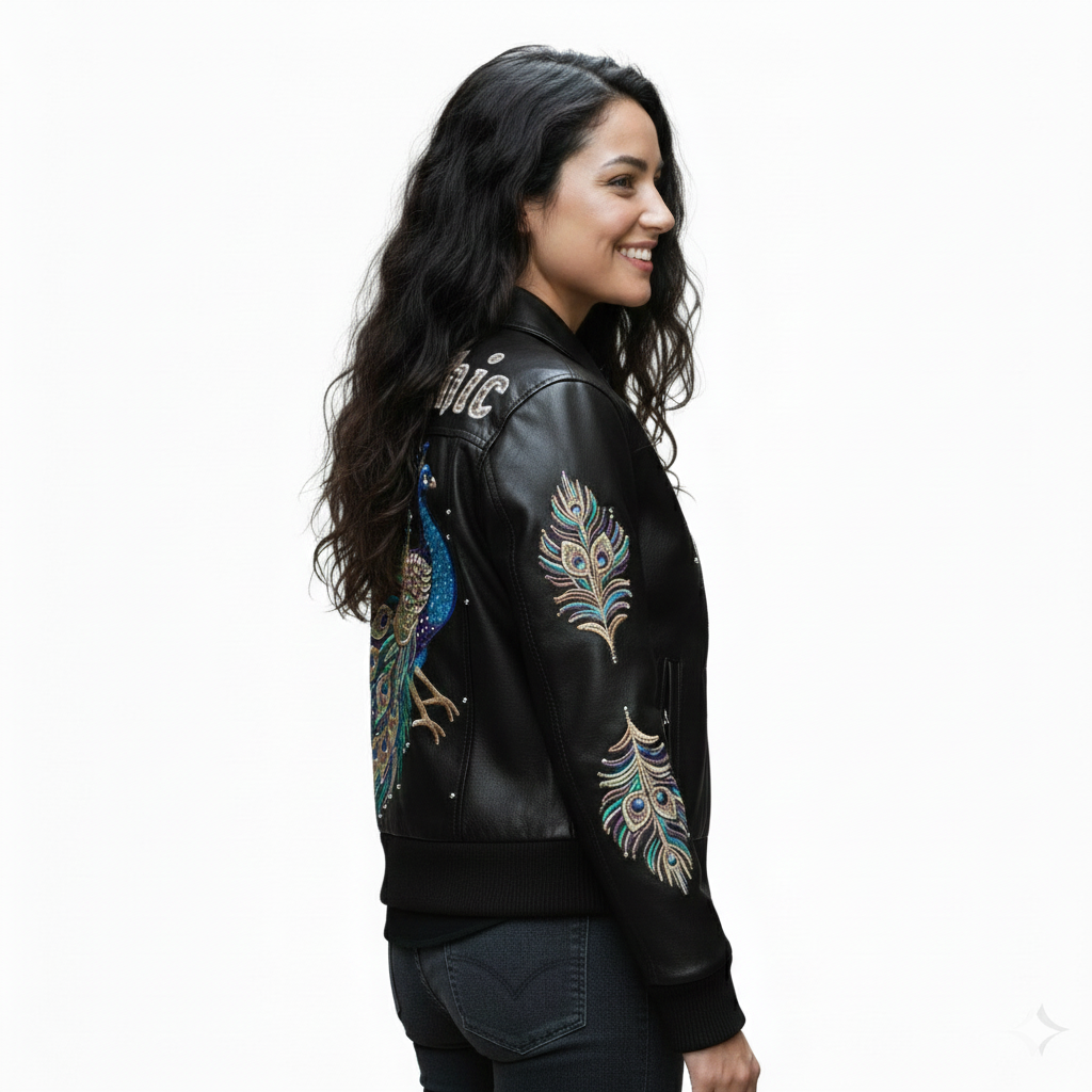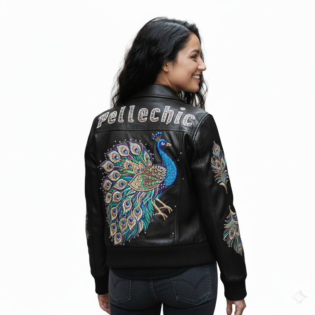 PelleChic™ Majestic Peacock Luxury Leather Bomber – Hand-Detailed Rhinestone Art Edition