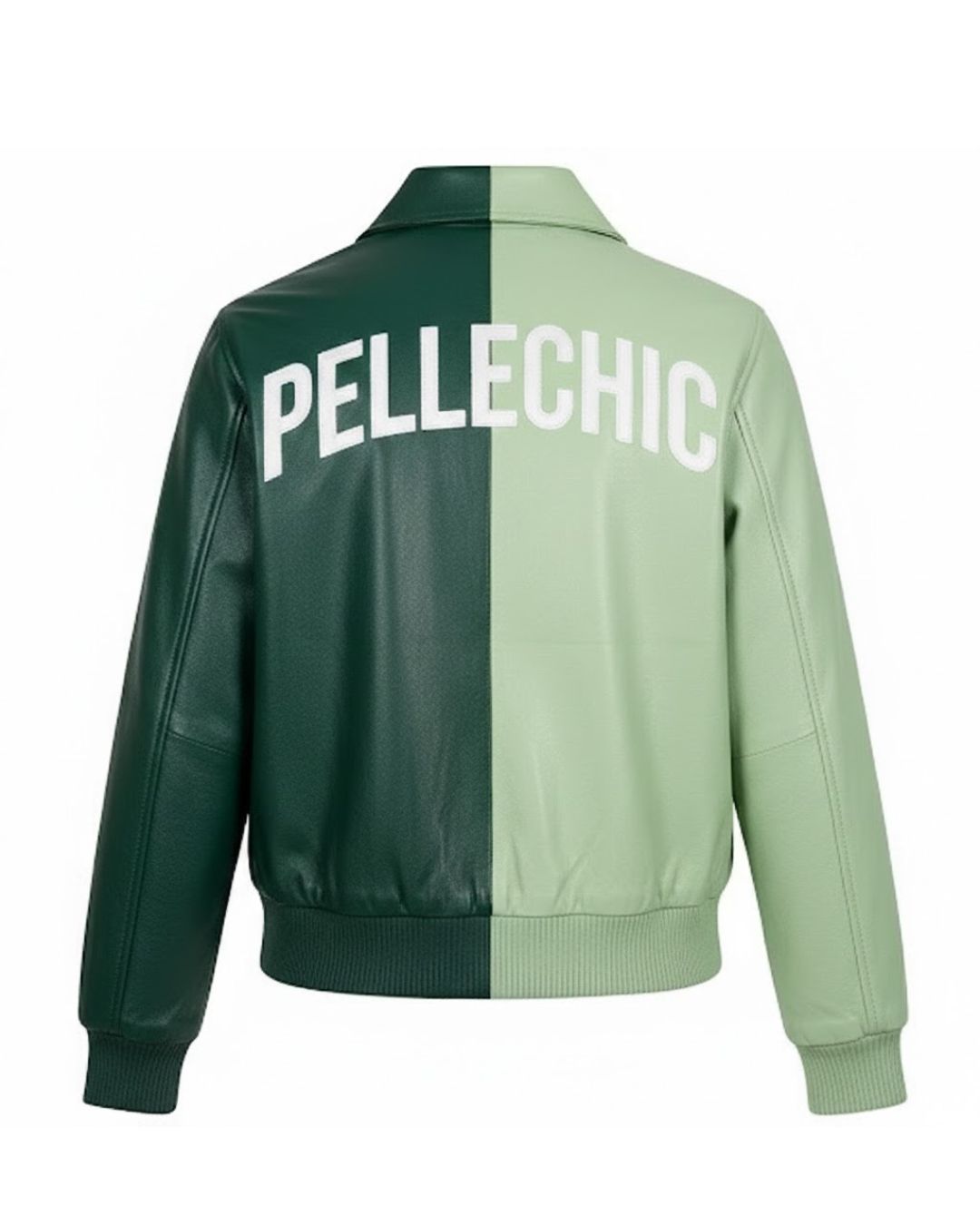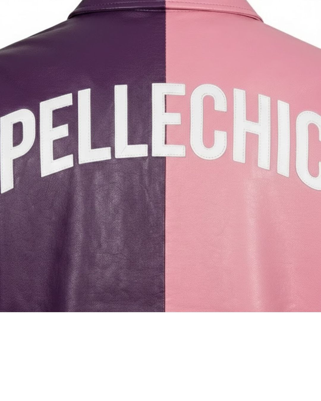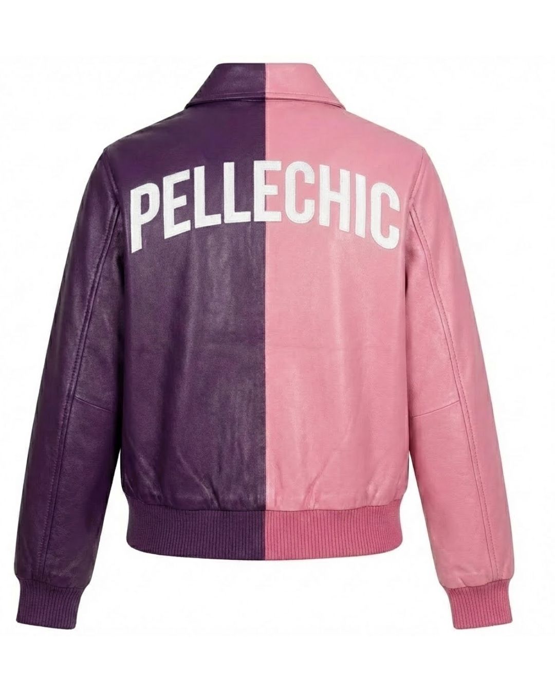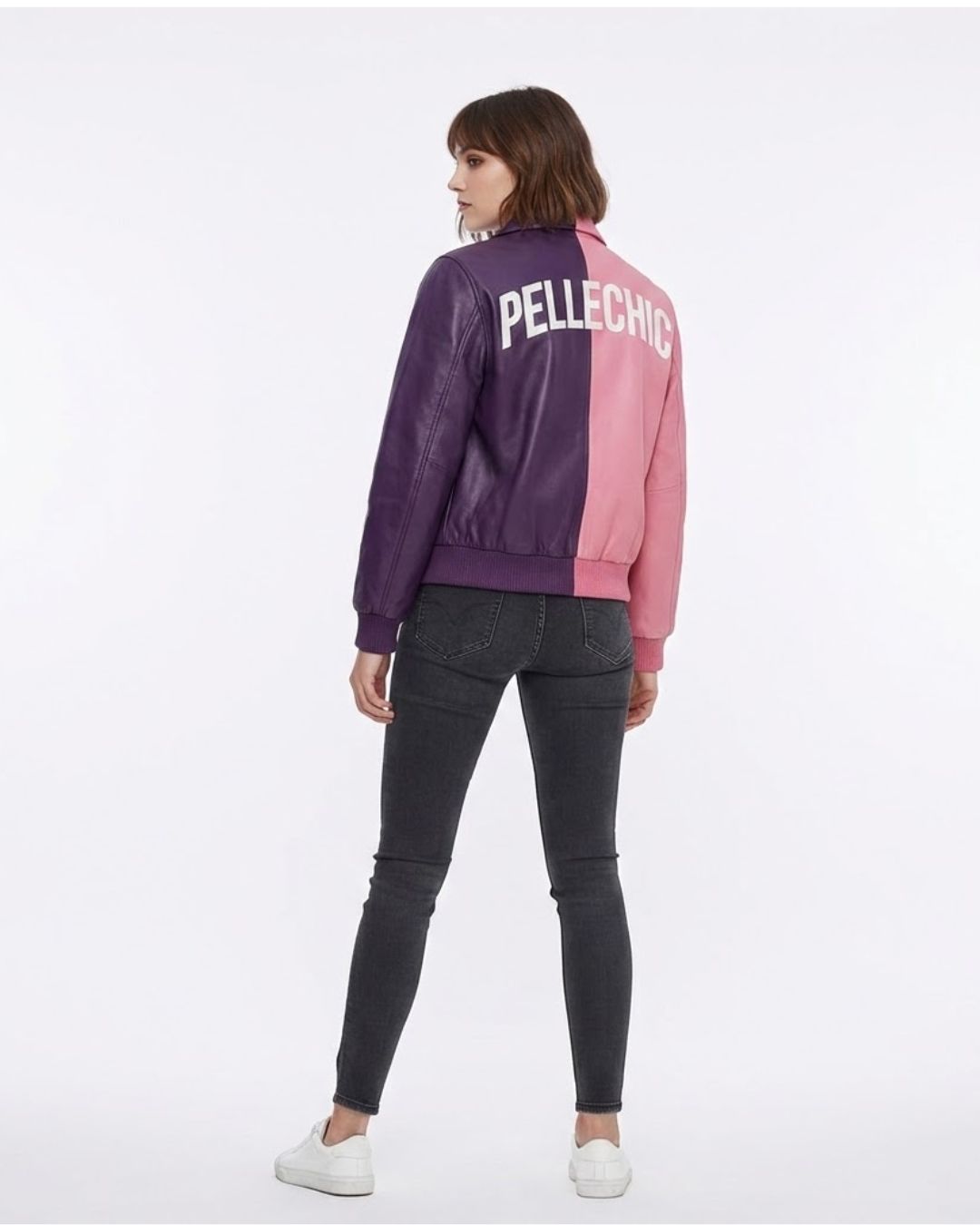 This Pellechic leather-style bomber jacket features a striking “split-colour” aesthetic that divides the garment into two bold sections. The right side is a deep, rich purple, while the left side transitions into a soft, vibrant pink. This high-contrast design is complemented by a classic shirt-style collar and a central silver metallic zipper. To ensure a comfortable fit, the jacket includes ribbed elastic cuffs and a matching waistband in both purple and pink tones, giving it a structured yet sporty streetwear silhouette.