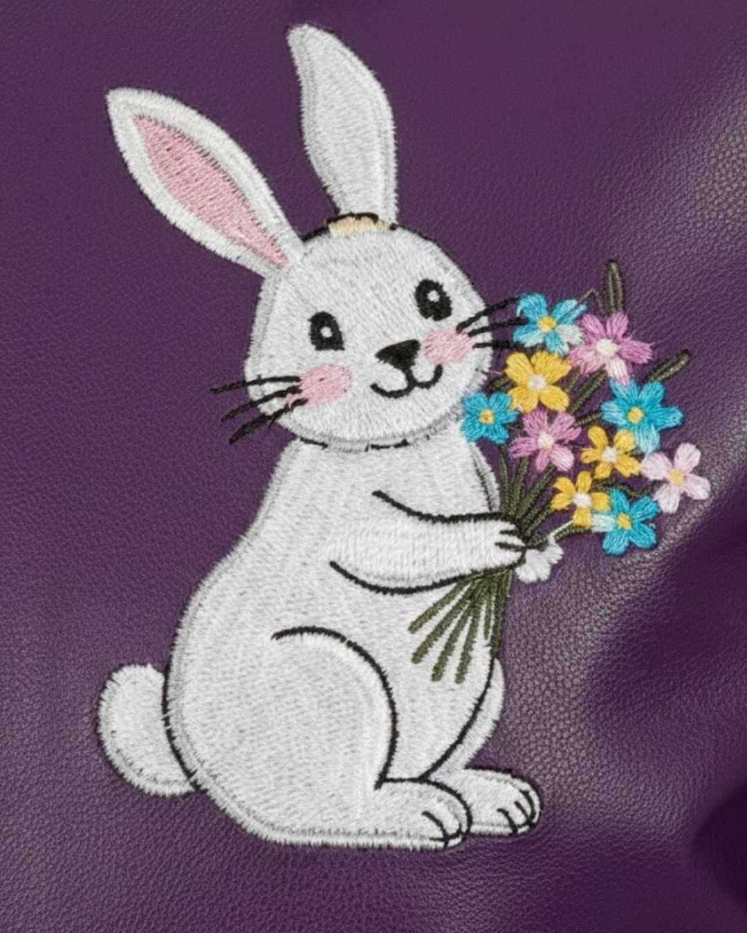 The jacket stands out with its unique artistic elements and practical features. On the purple side, there is a charming embroidered white rabbit holding a colourful bouquet of flowers, adding a touch of whimsy to the edgy leather look. The pink side features the “PELLECHIC” brand name in clean, white block lettering across the chest. Additionally, the jacket is equipped with two vertical zippered waist pockets, making it as functional as it is fashionable. It is a perfect statement piece for anyone looking to combine a playful vibe with a modern, high-fashion edge.