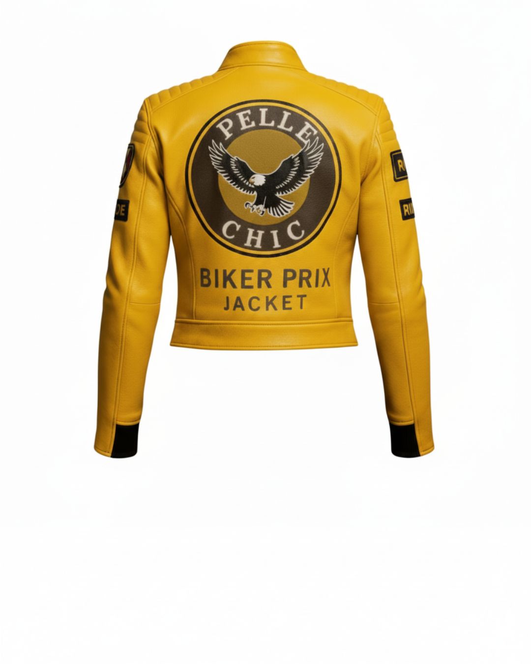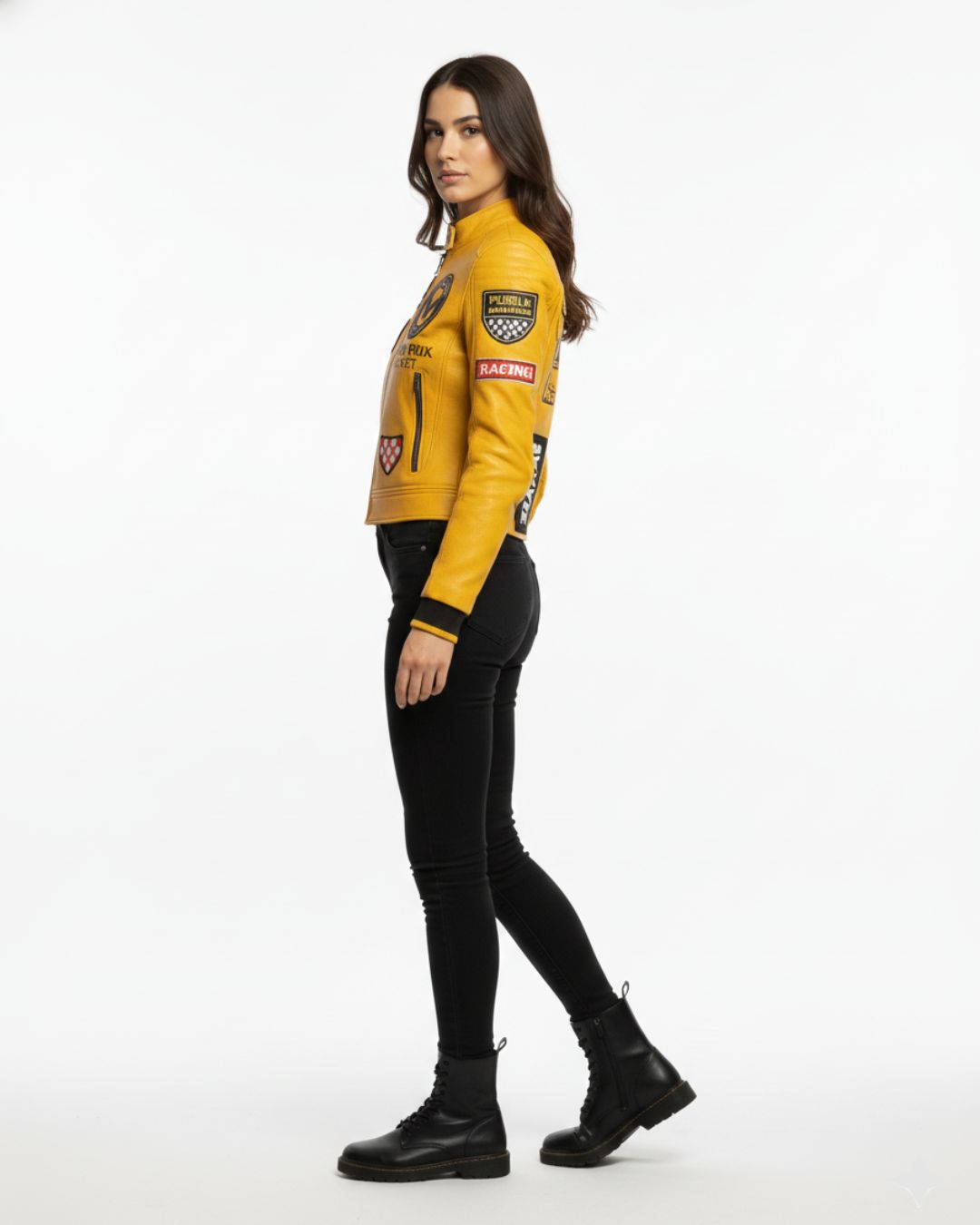 Rev up your style with this vibrant mustard yellow moto jacket. Designed with a sleek, cropped silhouette, this piece is heavily inspired by professional racing gear and street culture. It features a variety of authentic-style patches, including a prominent “Special” shield on the sleeve and “8” racing numbers on the front. The jacket is finished with a stand-up collar, vertical zip pockets, and black-and-yellow striped ribbed cuffs for a secure, athletic fit